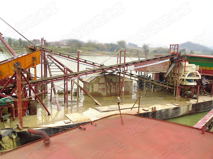 挖沙選鐵船由浮體、鏈斗挖沙系統(tǒng)、篩分系統(tǒng)、磁選系統(tǒng)、尾沙排除系統(tǒng)、動力系統(tǒng)組成。首先,河道里有水,我們的選礦設(shè)備必須要浮在水面上工作,因此我們用3.5-4毫米的鋼板做成了浮體,根據(jù)挖沙深度的不同,浮體的寬度和長度都有相應(yīng)的尺寸要求,一般寬度在1.5-2米之間,長度在16-32米之間。另外,增加船的穩(wěn)定性,兩個(gè)浮體之間間隔了一定的距離,一般為1.5米左右。顧名思義,這套選礦設(shè)備的上料系統(tǒng)是鏈斗式的挖沙系統(tǒng),河沙由鏈斗提上來以后,因?yàn)橛写笮〔灰坏氖?,為了保護(hù)磁選機(jī)的安全,必須經(jīng)過篩分系統(tǒng)。根據(jù)河道的環(huán)境不同,一般來說,石子比較少、直徑比較小的河道用自震式比較好,維修方便,節(jié)省動力(約5KW)。