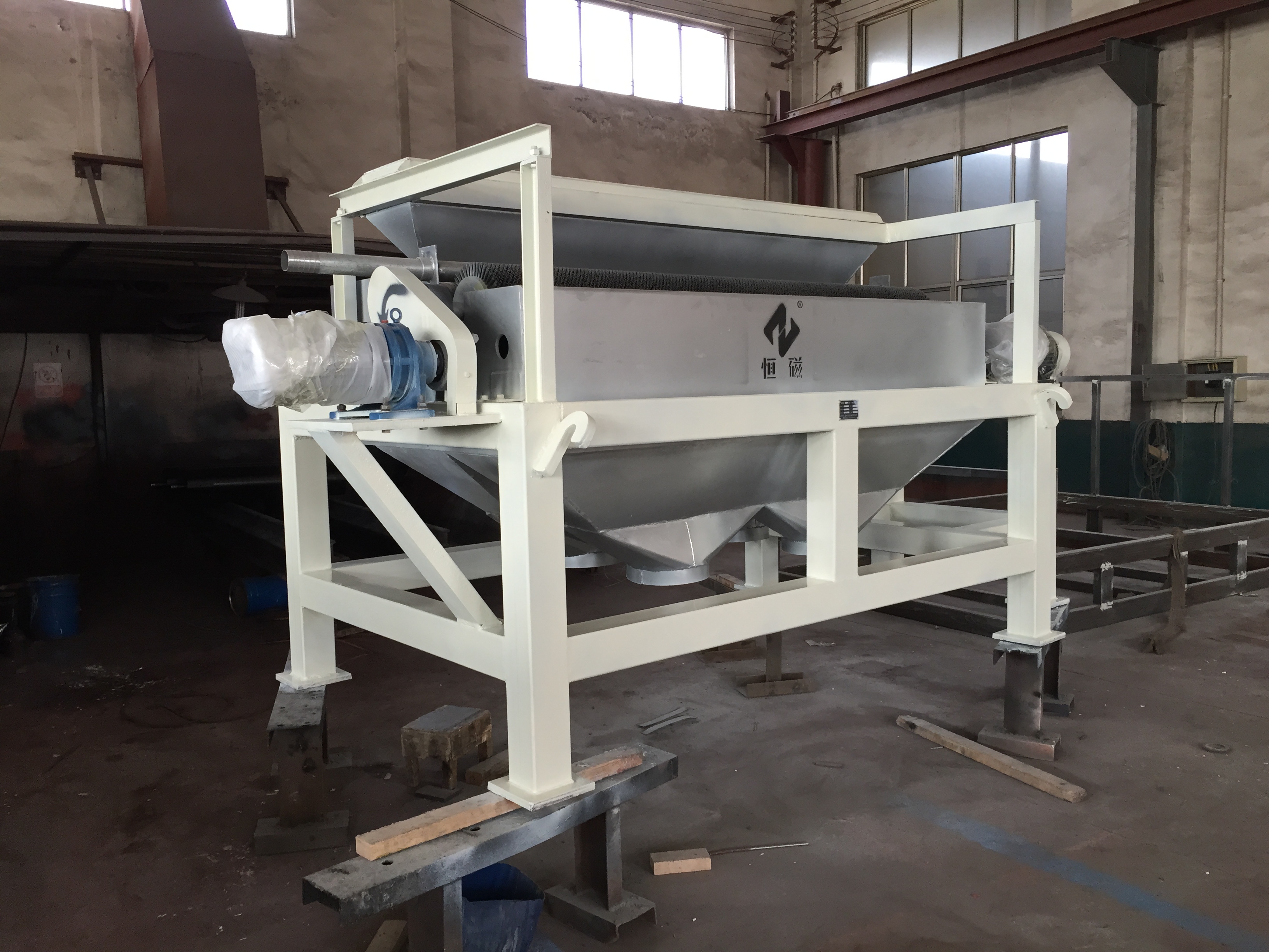 其原理為物料經(jīng)料倉(cāng)通過導(dǎo)料盤進(jìn)入磁場(chǎng)區(qū),磁性礦物被吸附在磁輥表面旋轉(zhuǎn)到達(dá)精礦區(qū),毛刷將吸附在磁輥表面上的磁性礦刷脫,在高壓水的噴射下落到精礦斗里,部分未被吸附的磁性礦粒、非磁性礦粒和磁性較弱的礦粒進(jìn)入到下一級(jí)再選。
