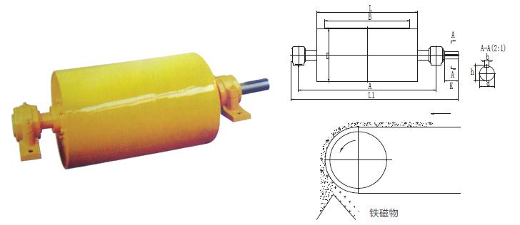 RCT型全磁滾筒與TD-75型、AD-80型通用固定式皮帶輸送機(jī)配套使用代替主動輪,也可與專用皮帶輸送機(jī)配套。