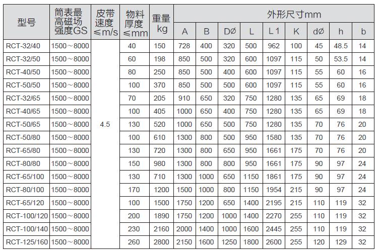 RCT型全磁滾筒與RCTG系列等同,亦稱磁滑輪或干式大塊磁選機(jī)。RCT型全磁滾筒其內(nèi)部采用高性能強(qiáng)磁材料組成強(qiáng)力磁系,具有磁場強(qiáng)度高、結(jié)構(gòu)簡單、使用方便、不需要維修、不消耗電力,常年使用退磁率小等特點(diǎn)。RCT型全磁滾筒可用于水泥、磁選、礦山、鋼鐵、化工、耐火材料、垃圾處理等行業(yè)的選鐵。